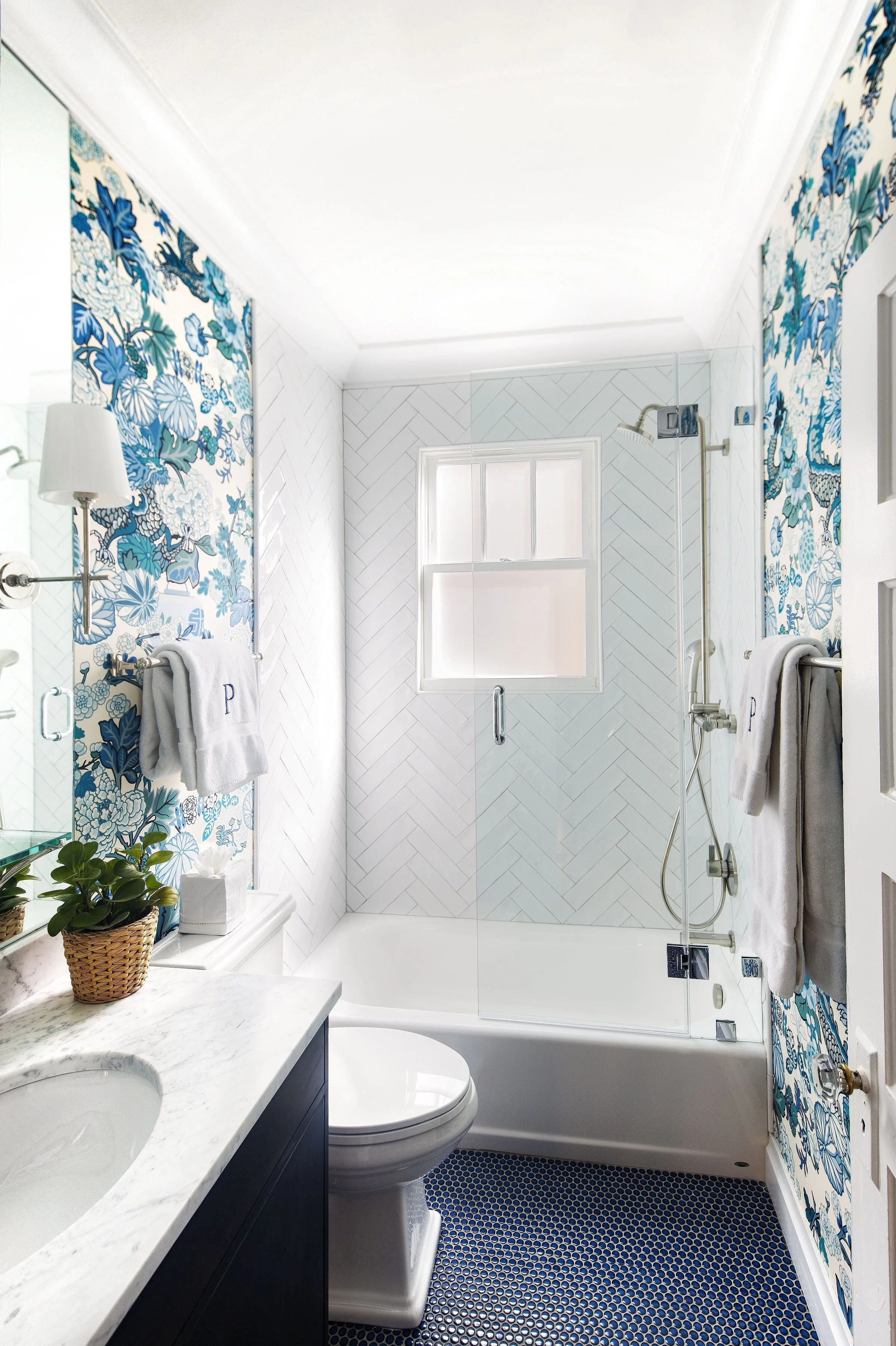 Our designs are proof that the right mix of materials, as well as a smart floor plan can bring a big impact to small spaces. We worked with this young family over the course of five years to make gradual, but impactful, improvements to each room in this house. What started as a tiny, 3-bedroom bungalow in the historic Rosemont District of Alexandria City, ended up being a glamorous little gem with 5 bedrooms and (at least) one spectacular bathroom! This project showcases how we are able to work with a few existing pieces from a client, and build on them to round out each room into a space that is comfortable, functional, and reflective of their personal style.